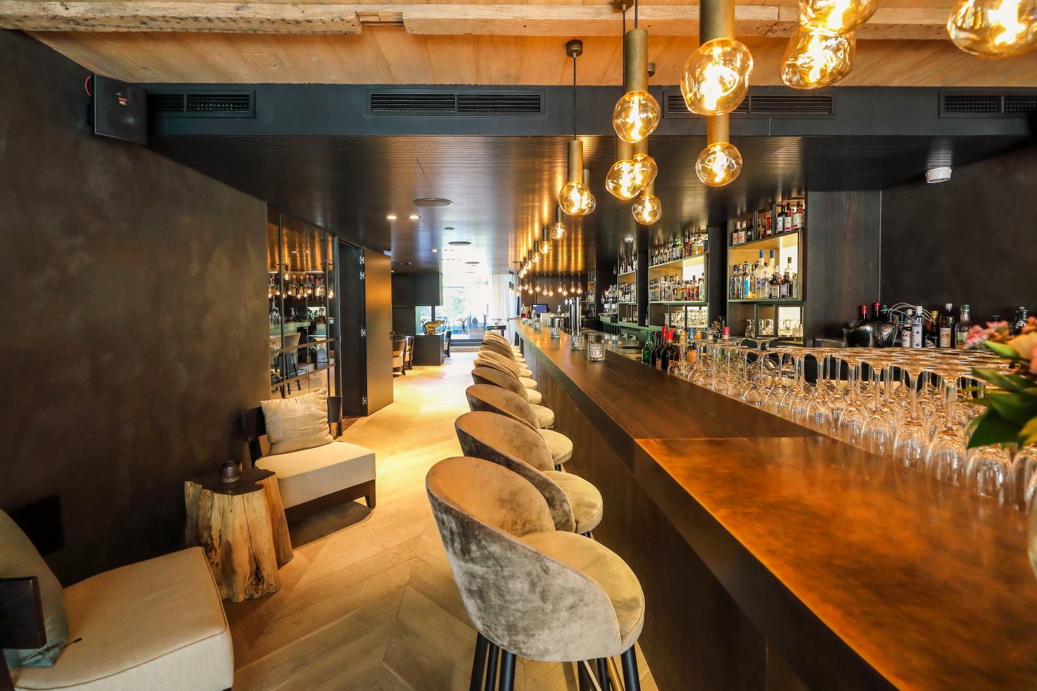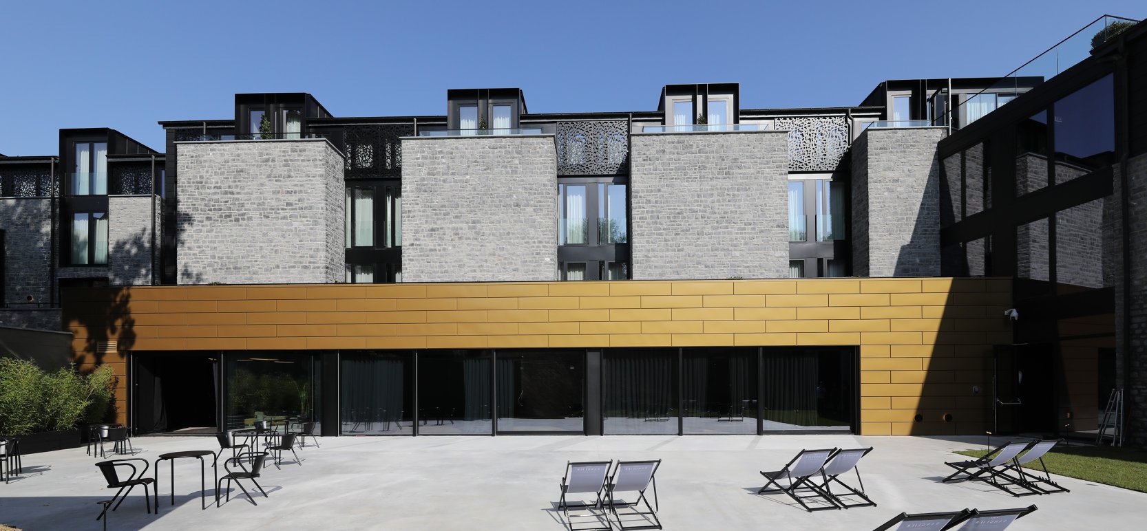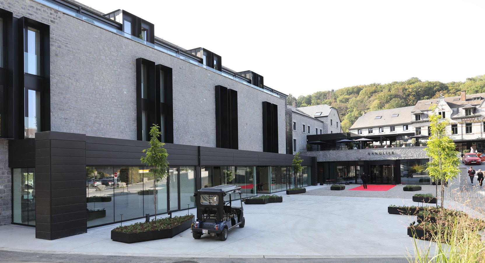 extension contemporaine. L’ancien bâtiment devait conserver sa fonction gastronomique, tandis que le nouveau allait intégrer un espace wellness et des salles de séminaire. Un soin particulier a été apporté à la