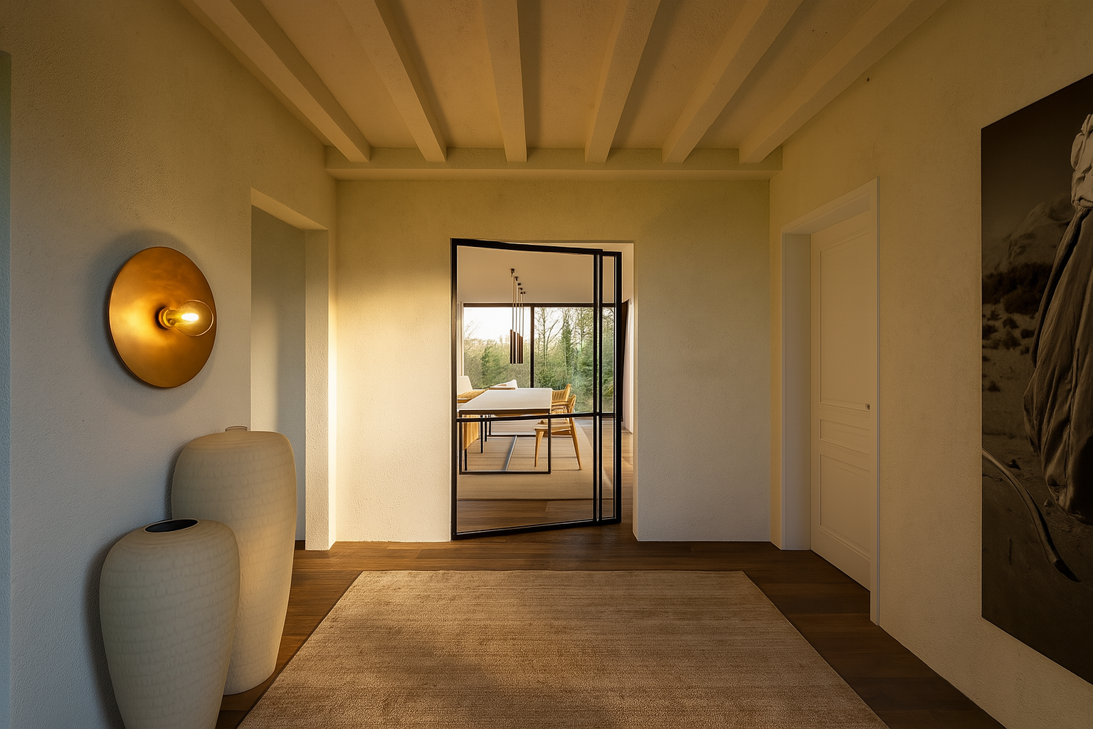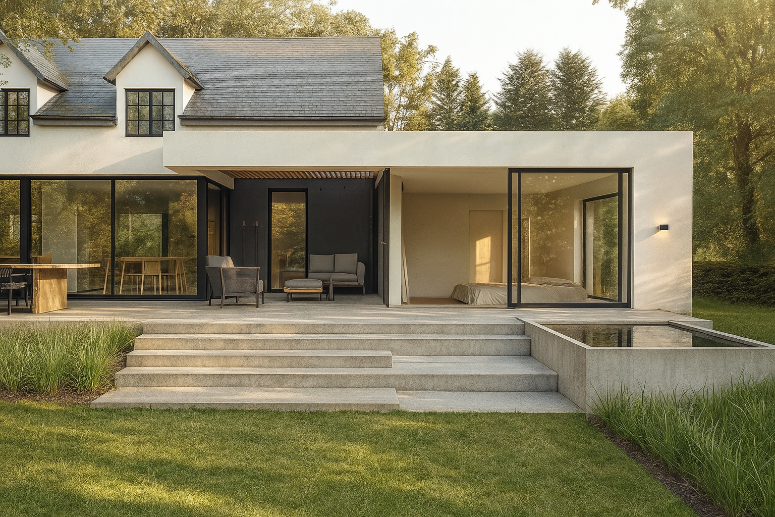 Derrière la fluidité et la légèreté visuelle du projet se cache une véritable complexité structurelle. Les volumes contemporains exigent des porteurs précis et discrets, capables de soutenir l’ouverture des façades tout en conservant la transparence souhaitée. L’usage réfléchi de matériaux sobres et cohérents assure l’équilibre entre l’architecture originelle et l’extension contemporaine.